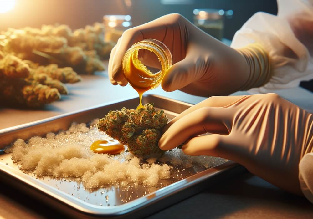When you have all your ingredients ready, proceed to the assembly of your Sunrocks. Start by fully covering each bud in concentrate using a dabber, small brush, or dropper. Then roll the coated buds in kief and shape them into little balls.