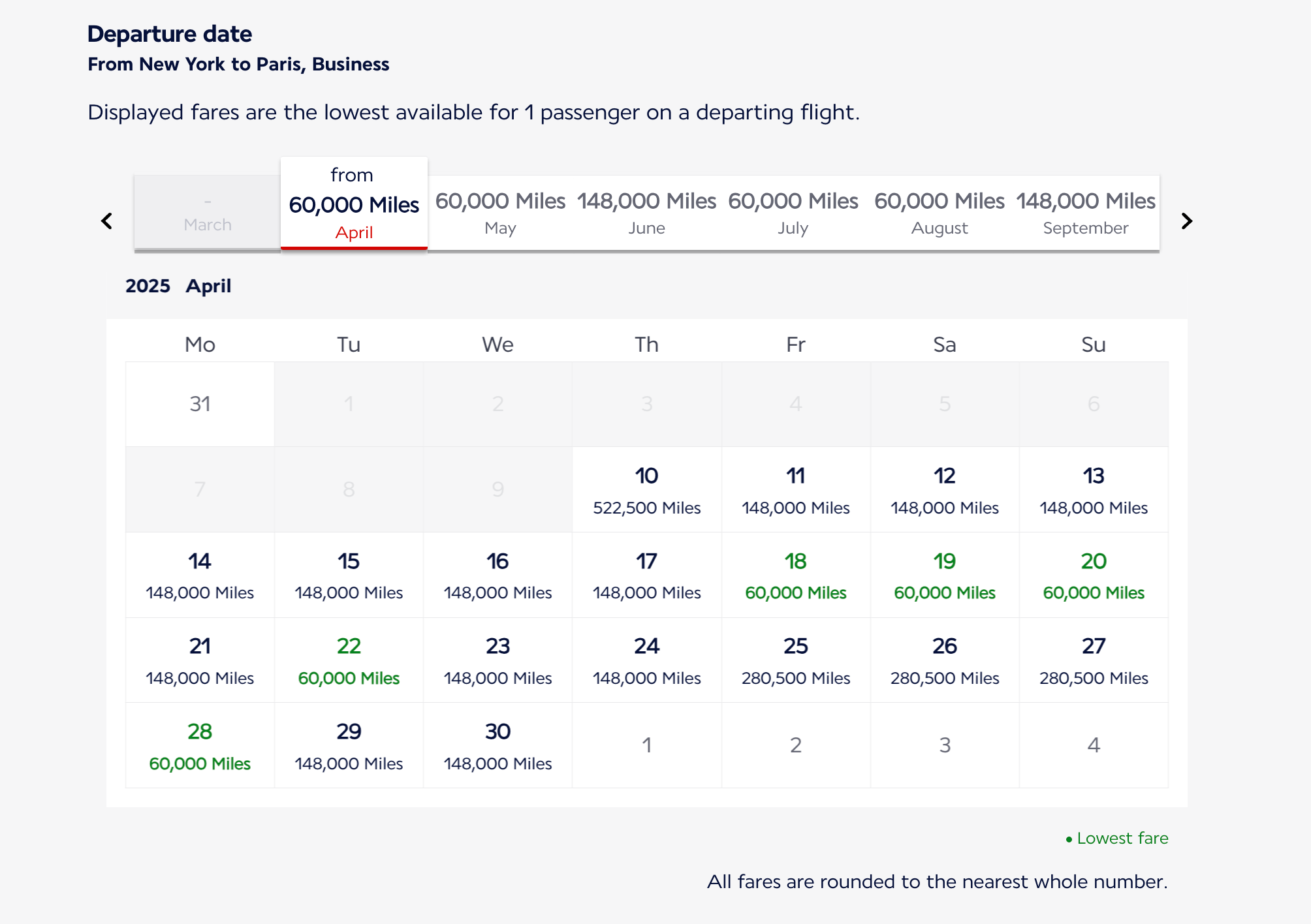 On the next page, you’ll see a calendar view; you can click through the months to find your desired date range. The lowest award price for each month will be shown in gray on the banner above and in green on individual dates.