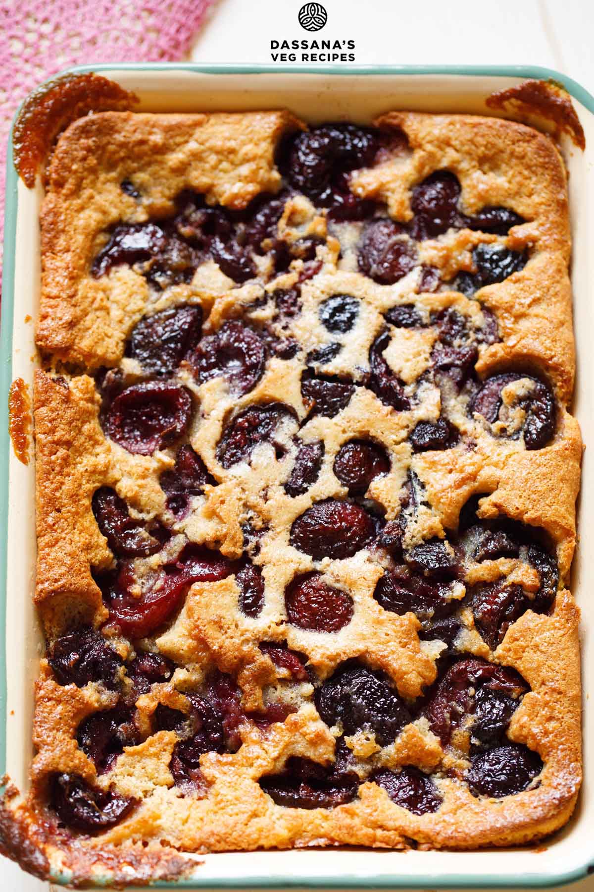 The edges turn lightly crisp and golden while the center stays soft and pudding-like. Baking time can vary depending on the oven, the size of the baking dish, and how juicy the cherries are.