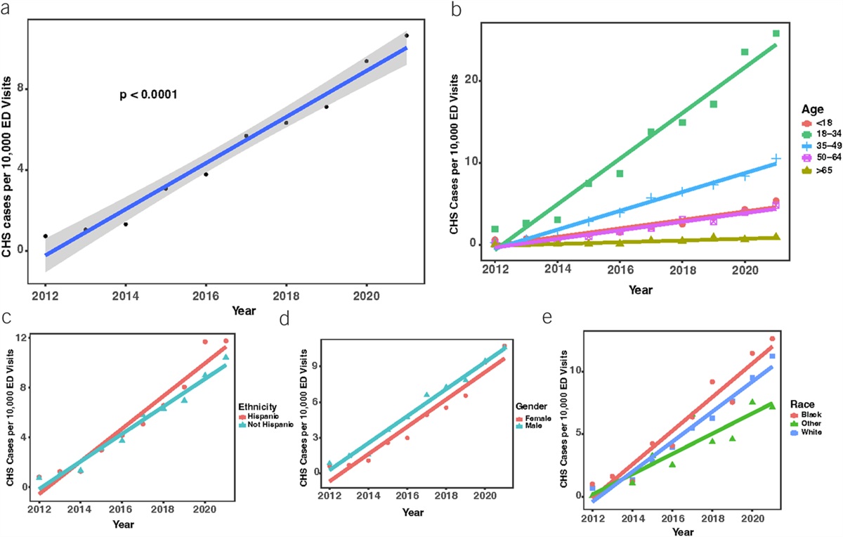 CHS cases per 10,000 emergency department visits increased from 0.729 to 10.6 in Massachusetts (2012–2021). Individuals aged 18–34 years experienced the fastest rise in CHS prevalence, with young adults, Hispanic individuals, Black individuals, and men having the overall highest 10-year prevalence.