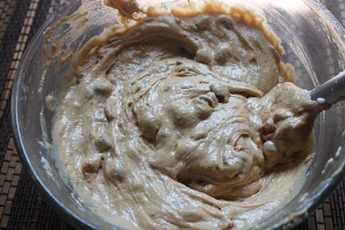 Now add in half of the flour mix in and fold gently. Add in the cooled caramel and mix well. Now add in the remaining flour mix in and fold gently.