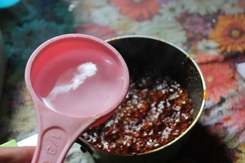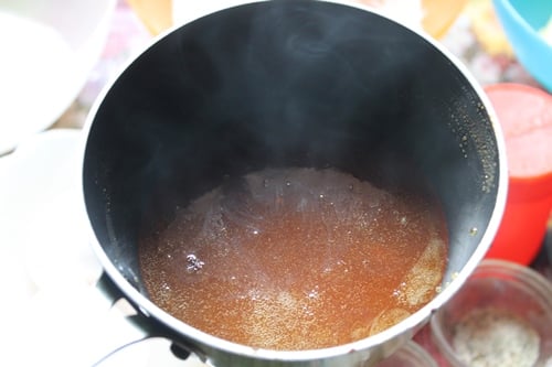 Now take sugar in a sauce pan and cook it on medium high heat till it gets golden in colour. Don’t stir the caramel, just swirl the pan. Now when the caramel reaches the nice colour add in water and mix well. Set aside to cool down.
