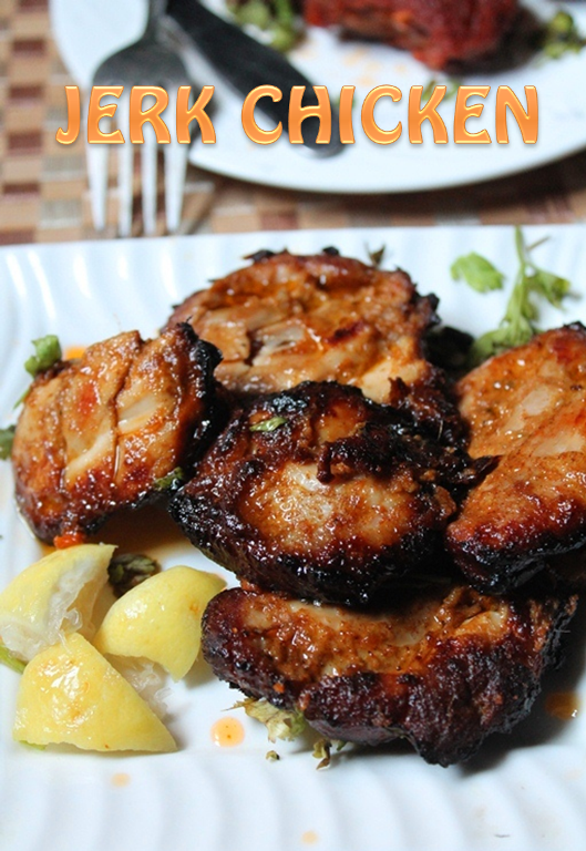 Jerk chicken is made using chicken and marinated with spices like onion, nutmeg, cinnamon, clove, chilli, ginger, garlic, soy sauce and lemon juice. The marinated sauce has a unique taste of sweet and spicy flavour. Chicken is then baked or grilled in the preheated oven. This is one of the simple, easy to make recipes and it tastes absolutely delicious.