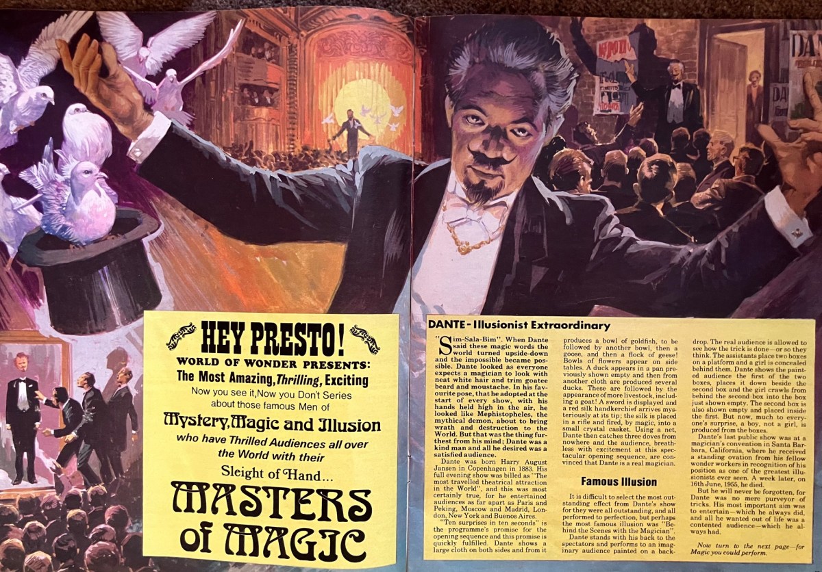 Now for the story. When I was a kid, I was fascinated by a magazine called World of Wonder (WoW). Each week it contained a great mix of history, science, geography and much more, and all the stories were illustrated with wonderful images. I was especially delighted when WoW ran a multi-part series on magicians, featuring some of the biggest names in the business. My favourite story by far was based around the great Danish-American illusionist Dante, and the huge, colourful, double page spread became etched into my mind.