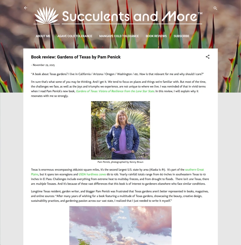 Last week Gerhard Bock, the talented garden writer, photographer, and blogger at Succulents and More, reviewed Gardens of Texas. He explained the book’s relevance for West Coasters (and other non-Texans) like himself, shared how it stands out from other regional books, and called out his favorite gardens. I especially love that he cited a few quotes from my interviews with the garden makers — words about the lived experience of gardening that resonated with him.