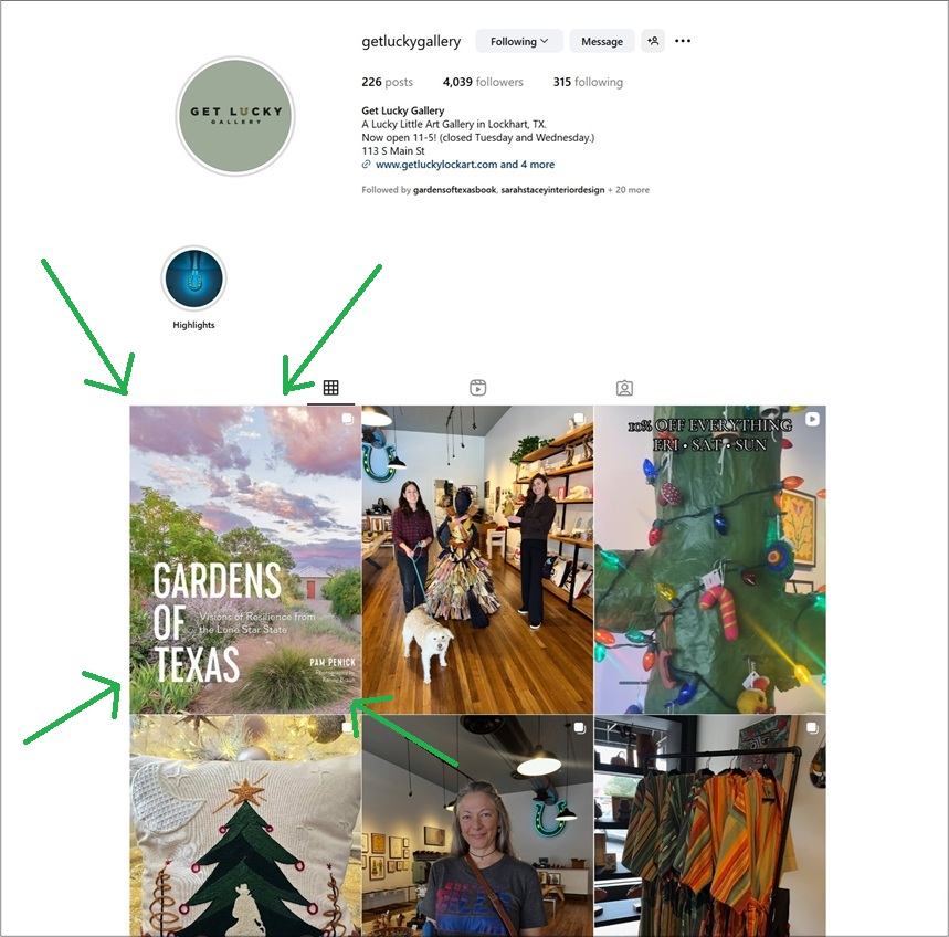 Lastly, if you’re looking for something festive to do this Friday evening in the wider Austin area, join me in Lockhart. I’ll have a book signing at Get Lucky Gallery, 5 to 8 pm, on the charming downtown square. It’s part of First Friday, when businesses stay open late and everyone comes out for a good time. Get Lucky is a uniquely Lockhart gift shop and gallery featuring one-of-a-kind local artists. Come say howdy, pick up a signed copy of Gardens of Texas, and check some lucky folks off your holiday shopping list!