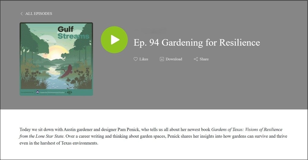 Today you’ll find me chatting about sustainable gardening in Texas on the podcast Gulf Streams with host Weston Twardowski. I hope you’ll take a listen.