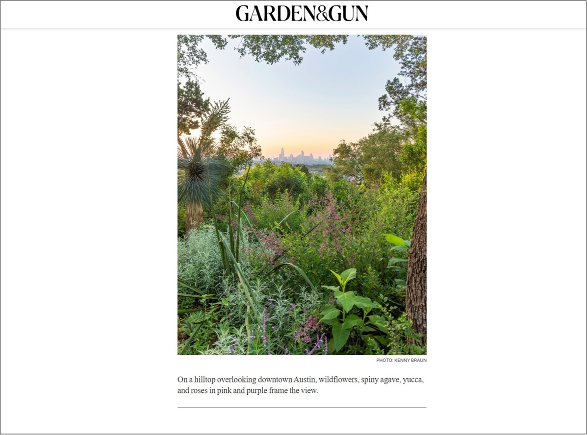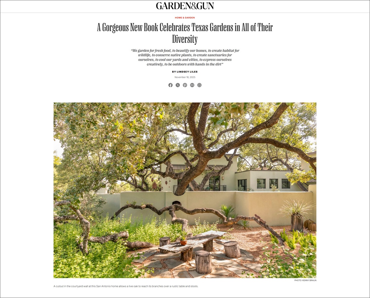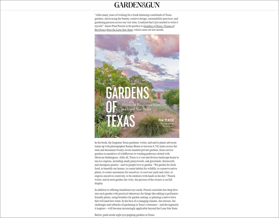 Garden & Gun, a national magazine celebrating the culture, food, music, tradition, and people of the South, featured my new book this week! Writer Lindsey Liles calls Gardens of Texas “gorgeous” with “twenty-seven standout private gardens.”