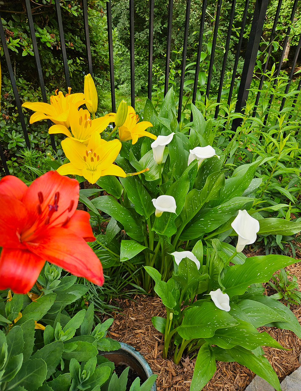 This first corner looks to be dedicated to lilies. Some colorful true lilies bring the heat and bright white calla lilies add another form while keeping the bed balanced.