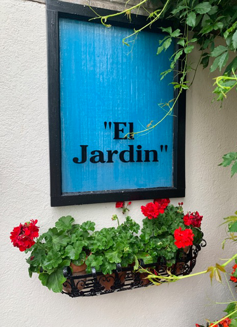 This is a vintage office window. El Jardin (Spanish for “the garden”) is hand-painted by a local artist. Geraniums are in the window box.
