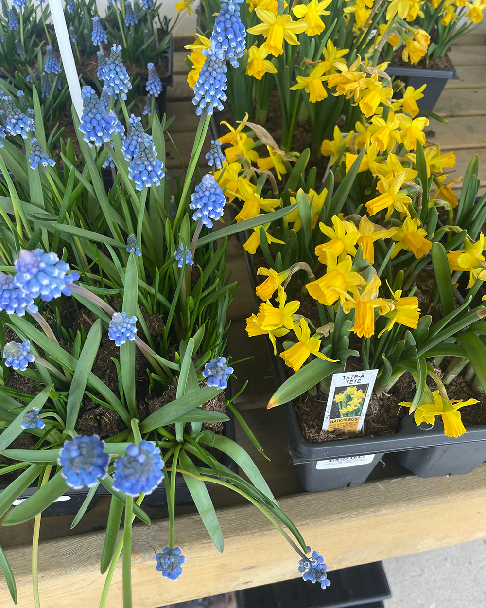 Spring bulbs are just starting to reach their peak in Connecticut, but I’ve gotten a great first taste from garden center and nursery displays. These stunning Tete-a-Tete daffodils (Narcissus ‘Tete-a-Tete’, Zones 4–8) and ‘Blue magic’ grape hyacinth (Muscari aucheri ‘Blue magic’, Zones 4–8) were outside one of my favorite local garden centers, Woodbury Farm Market in Woodbury, CT, when I went to buy some soil and supplies. I resisted the urge to add a few trays to my basket, but they were such a lovely pairing I had to snap a picture.