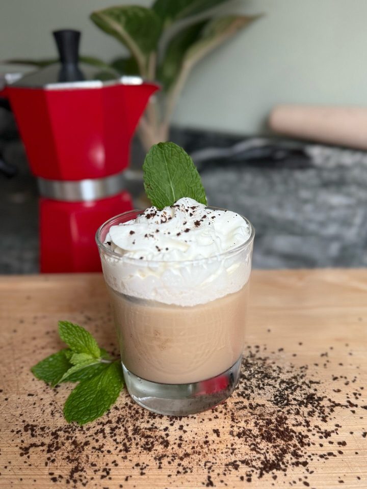 Add all ingredients to a glass and use a milk frother or shake vigorously to blend. Top with whipped cream.