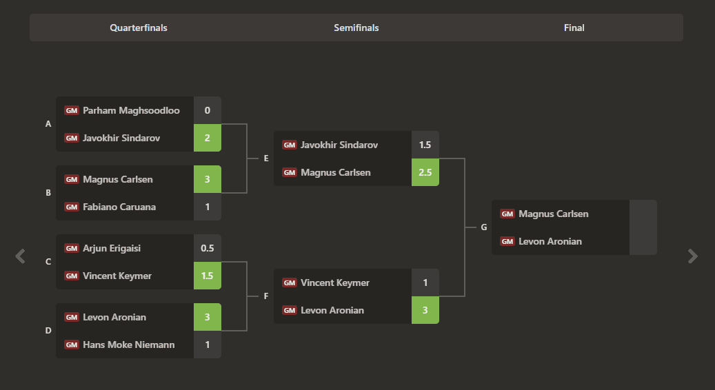 Carlsen and Aronian won the two matches in the Upper Bracket, against Sindarov and Keymer.