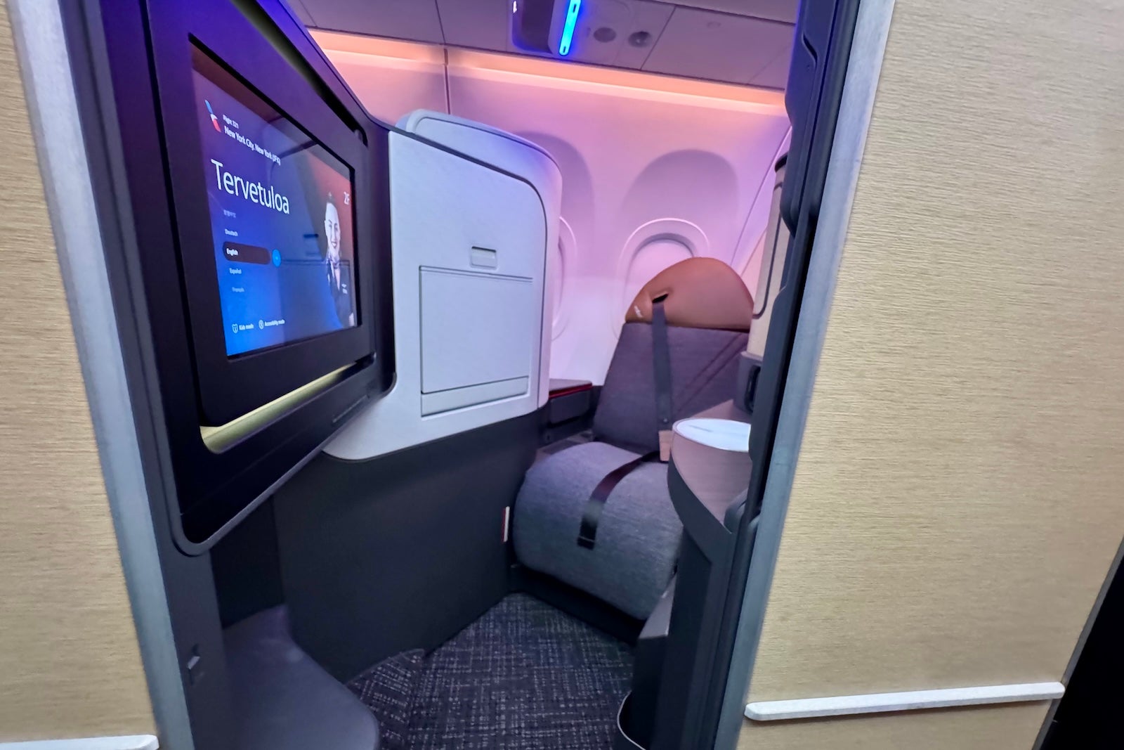 Up-front in the business-class cabin, you’ll find 20 of the carrier’s new enclosed Flagship Suites, complete with sliding privacy doors (which passengers should be able to close … soon, once the airline gains certification for that feature).