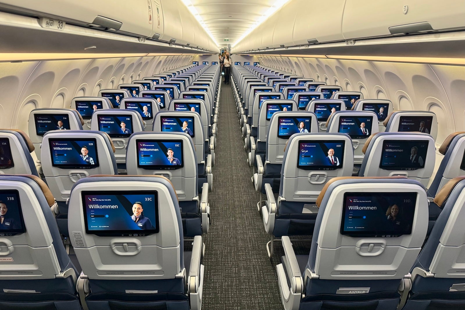 You’ll also notice some variety in the headrests: Brown denotes the airline’s extra-legroom Main Cabin Extra section, with navy blue signifying a standard coach seat.