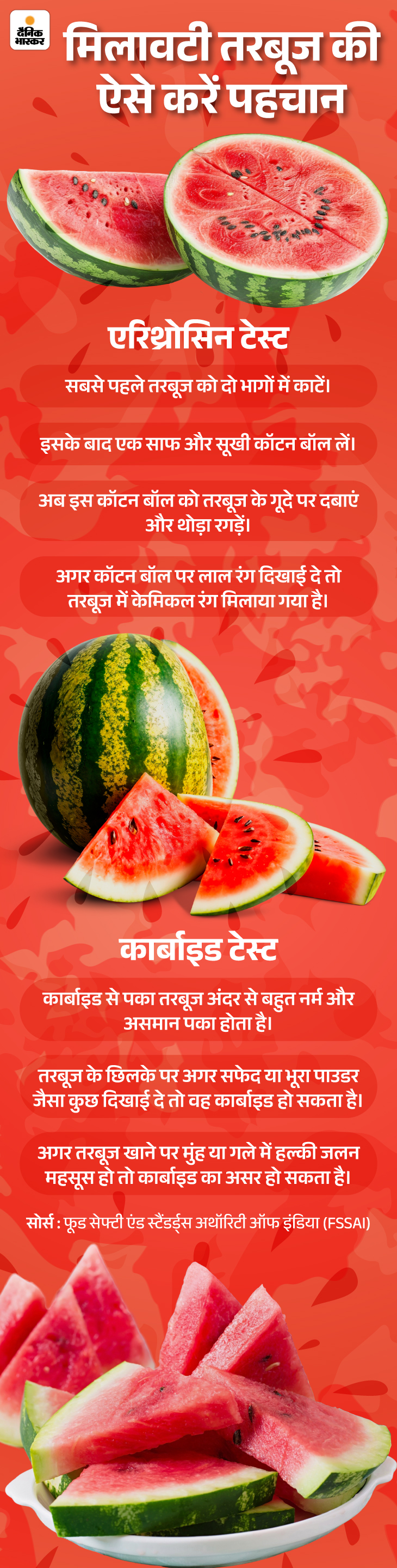 जवाब- मिलावटी तरबूज की पहचान करने के लिए फूड सेफ्टी एंड स्टैंडर्ड्स अथॉरिटी ऑफ इंडिया (FSSAI) ने एक वीडियो जारी किया है। इस वीडियो में FSSAI ने कुछ तरीके बताए हैं, जिनकी मदद से आप घर पर आसानी से तरबूज में मिलावट की पहचान कर सकते हैं।