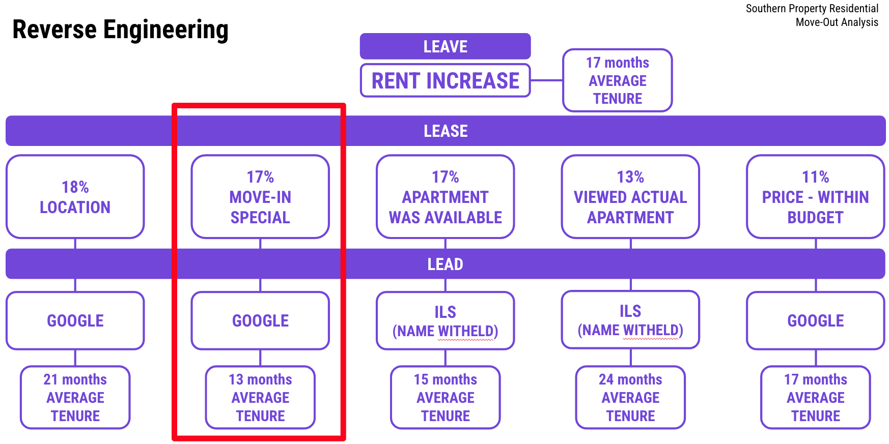 Lia then recommended that companies use this same data to reverse engineer the resident journey and analyze lead and lease attribution through the lens of the renters’ ultimate reason for leaving the property. This leads to unique insights — in the example data set she showed, among residents who ultimately left due to a rent increase, residents who originally chose to lease due to a move-in special had the shortest average tenure.