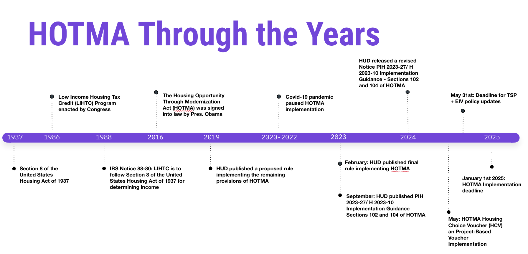 They began with a bit of context on the history of HOTMA, going back even before it was signed into law in 2016. Although the COVID-19 pandemic paused HOTMA implementation, HUD published additional rules and implementation guidelines in 2023.
