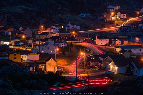From Fogo Island in Newfoundland. This image is a stack of 3 exposures, all at f/16 and 30 seconds. I used f/16 to get star-spikes with the street lamps, and the 30 second exposure was enough time to capture car head lights and tail lights moving through the frame. In Photoshop I stacked all 3 exposures as layers and set the top 2 layers to the Lighten blend mode so that only the brighter pixels (lights) blended in with the bottom layer. This gave me more car light trails in the final image. I could have shot a single shot at 90 seconds or two minutes, etc, but by stacking shorter length exposures I have greater control over the final image, I can mask out any lights that overlapped too much or didn’t make the image look good.