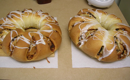 Divide the dough into 2 pieces. Roll out each piece into a 9 by 18 inch rectangle. Spread each rectangle with 2 tbsp butter and sprinkle with 1/2 cup sugar, 2 tsp cinnamon, 1/2 cup nuts, and 1/4 cup currants. Starting with a long end, roll each rectangle tightly as for a jelly roll. Pinch the seam to seal. Transfer the rolls seam side down to lightly greased baking sheets. Bring the ends of the rolls together to form a ring and seal tightly.
