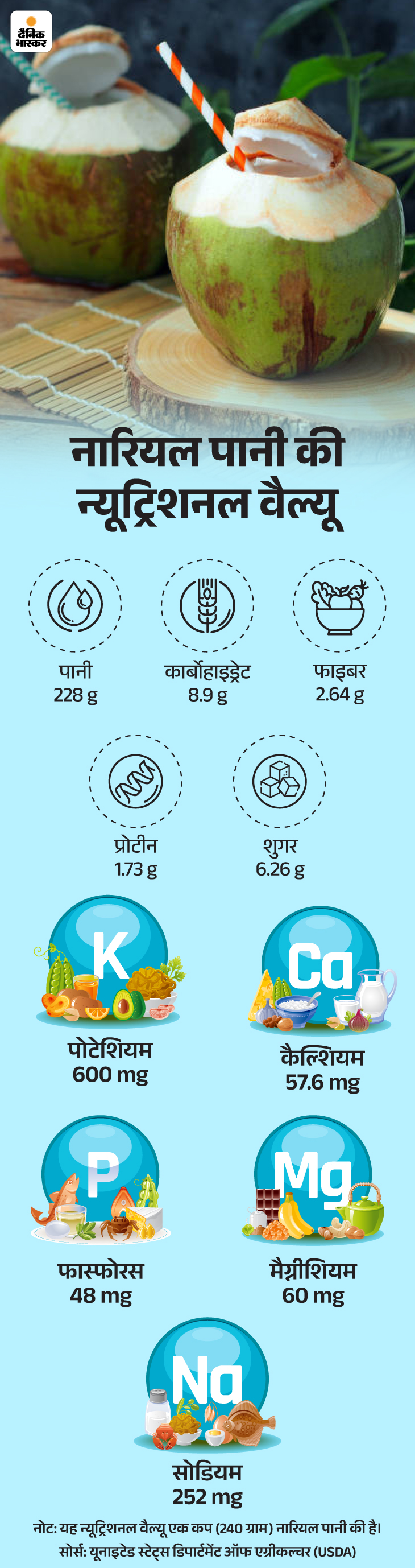 जवाब- यूनाइटेड स्टेट्स डिपार्टमेंट ऑफ एग्रीकल्चर (USDA) के मुताबिक, नारियल पानी में पोटेशियम, सोडियम, मैग्नीशियम, कैल्शियम, फास्फोरस, जिंक, मैंगनीज और कार्बोहाइड्रेट समेत कई न्यूट्रिएंट्स पाए जाते हैं, जो शरीर के लिए बेहद जरूरी हैं। नीचे दिए ग्राफिक में एक कप यानी 240 ग्राम नारियल पानी की न्यूट्रिशनल वैल्यू जानिए-