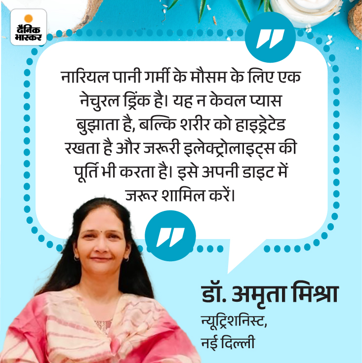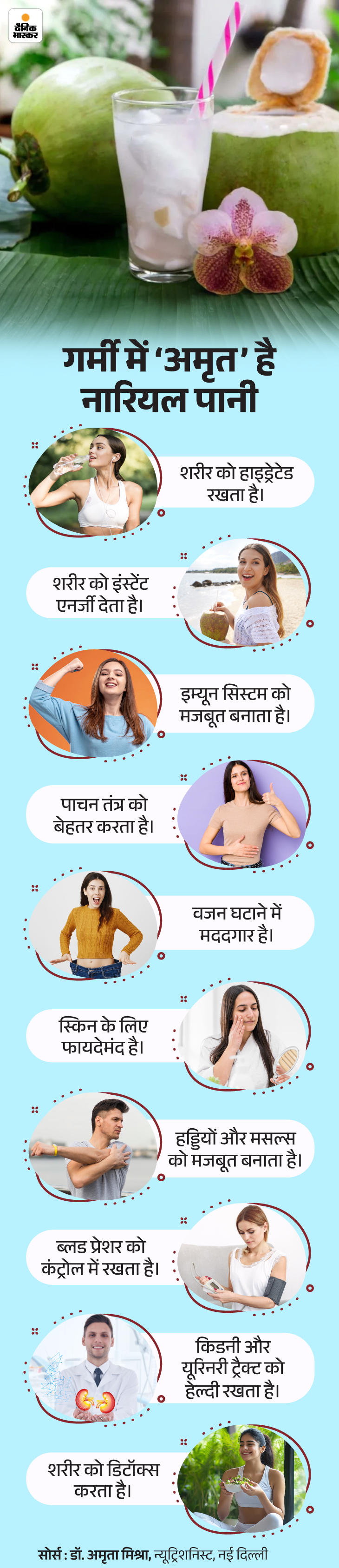 नारियल पानी में लगभग 95% पानी होता है, जो गर्मी में डिहाइड्रेशन से बचाने में कारगर है। इसमें नेचुरल शुगर होती है, जो इंस्टेंट एनर्जी देती है। इसकी तासीर ठंडी होती है, जो गर्मी में शरीर को अंदर से ठंडक प्रदान करती है और ताजगी महसूस कराती है। यह एक नेचुरल ड्रिंक है, जिसमें आर्टिफिशियल कलर, स्वाद या प्रिजर्वेटिव नहीं होते हैं, जो इसे गर्मी के लिए एक हेल्दी विकल्प बनाते हैं।