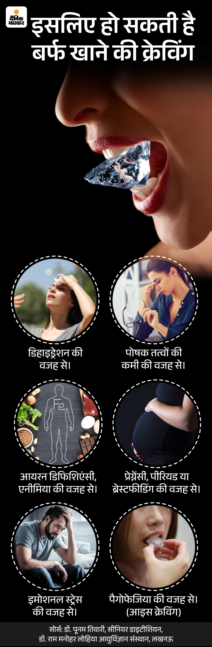 जवाब- आइस क्रेविंग कई कारणों से हो सकती है। ऑनलाइन डेटाबेस ‘साइंस डायरेक्ट’ में पब्लिश एक स्टडी के मुताबिक, शरीर में आयरन की कमी होने पर कुछ लोगों को बर्फ खाने की क्रेविंग हो सकती है। हालांकि यह अभी पूरी तरह से स्पष्ट नहीं है कि ऐसा क्यों होता है। प्रेग्नेंसी, पीरियड और ब्रेस्टफीडिंग के दौरान महिलाओं में आयरन की कमी होने का खतरा बढ़ जाता है, जिससे उन्हें बर्फ खाने की तलब लग सकती है।
