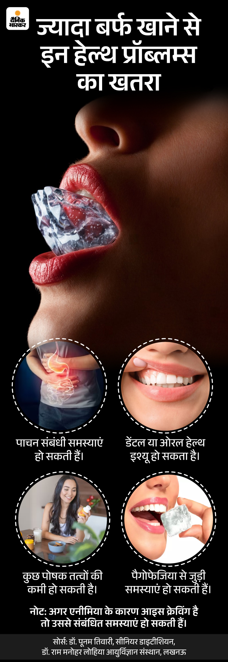 जवाब- यह इस बात पर निर्भर करता है कि बर्फ कितनी बार खाते हैं और इसका कारण क्या है। हालांकि थोड़ी मात्रा में बर्फ खाना आमतौर पर खतरनाक नहीं होता है। लेकिन बहुत ज्यादा बर्फ खाने से दांतों के इनेमल खराब हो सकते हैं और सेंसिटिविटी हो सकती है। इसके अलावा और भी कई प्रॉब्लम्स का खतरा बढ़ जाता है। इसे नीचे दिए ग्राफिक से समझिए-