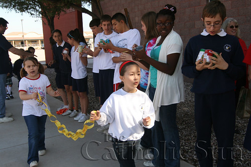 The St. Vincent de Paul chapter at St. Benedict Parish in Phoenix benefited from the “Cans Across Campus” project at St. John Bosco Interparish School. Students donated canned goods, toiletries and other non-perishables. Some 550 of them paraded items across campus to the parish food closet.