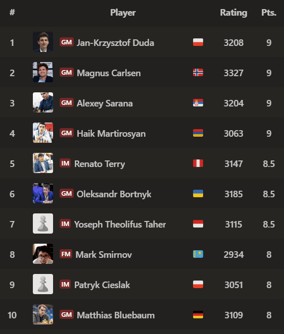 The win brought Maritrosyan into a tie for first with 9/11, along with Carlsen and GM Alexey Sarana. Meanwhile Duda defeated Terry to join the leaders and claim the best tiebreak score.