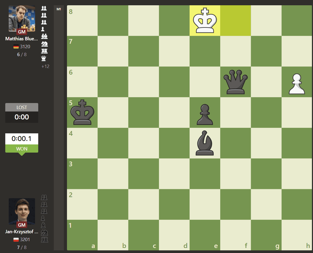 Duda started the first tournament well, winning his first six games, before dropping a point to GM Sina Movahed. He faced a critical test against GM Matthias Bluebaum in the eighth round. Bluebaum took over, but was a fraction of a second too slow and Duda scored a fortunate victory.