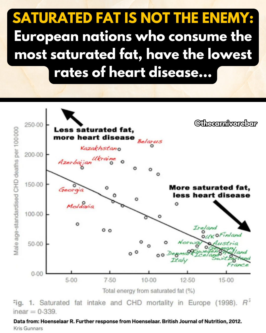 Graph: Saturated fat intake versus heart disease decline