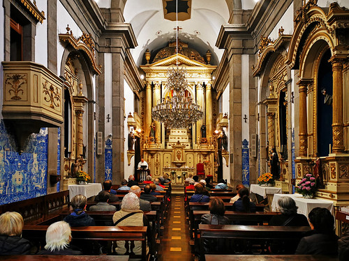 The Capela de Santa Catarina, which is also known as the Capela das Almas, is a chapel located in the shopping street Rua de Santa Catarina, in the city of Porto’s quarter Santo Ildefonso. It is particularly noted for the blue azulejo tiles on its exterior walls. To take this picture of the chapel’s interior during a worship service was not very respectful from me for sure, but for one thing I simply couldn’t resist and for another thing I stood near the entrance while trying to not disturb the worhshippers during their devotions.