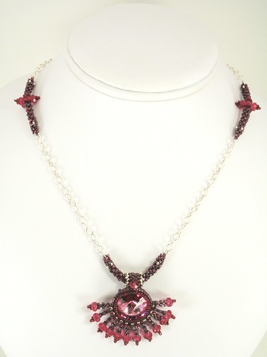 Deep pinks and silver combine to make this one of a kind beadwoven necklace. I used a large Swarovski crystal rivoli as the center of my fan pendant. Off the crystal are beadwoven arms that flare outward with the same pink color rondelles. Connecting each beadwoven rope section is a short chain of sterling silver. The clasp is a sterling silver hook and loop.