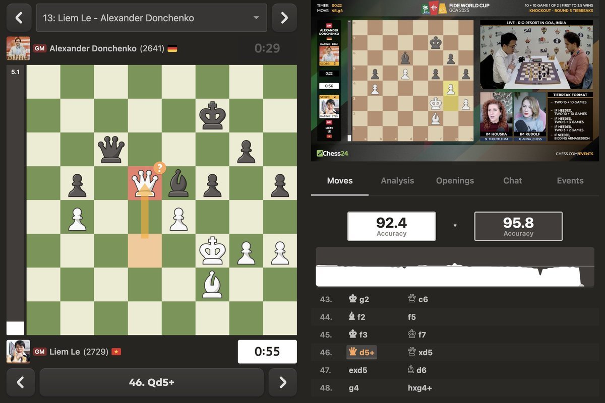 16th-seed Sindarov is the highest remaining in the top-half of the bracket after 61st-seed Donchenko knocked out 13th-seed Le. It came despite Donchenko missing a huge chance to win the second classical game, with the German GM reasoning: