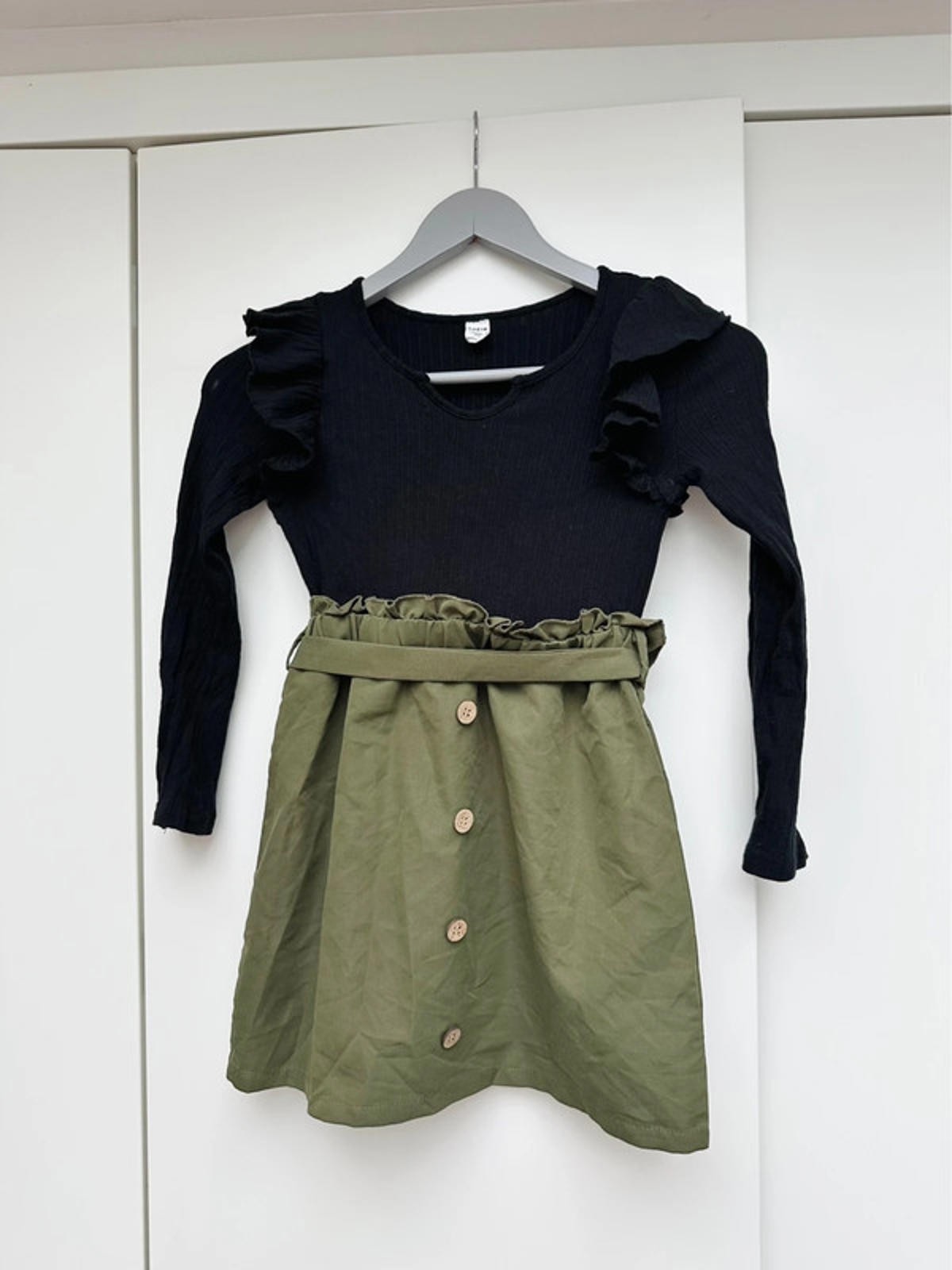 Girls Khaki Green Button one piece Dress Stitched Black top Size 8 Age Shein