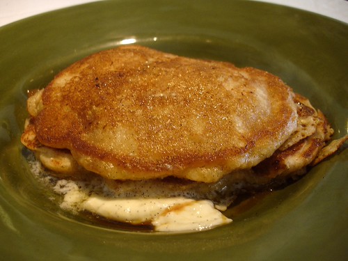 In a large sauté pan over medium-high heat, heat a small amount of oil. Pour about 1/3 cup of the pancake mixture onto the pan and cook, without turning, until small bubbles just begin to appear on the top of the cake. Flip and cook the other side.