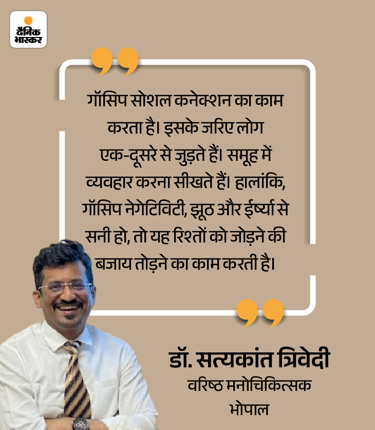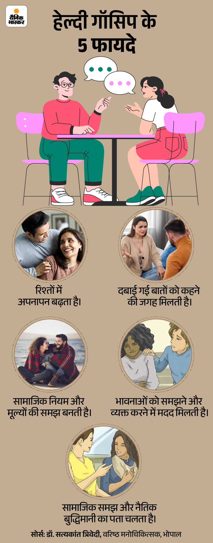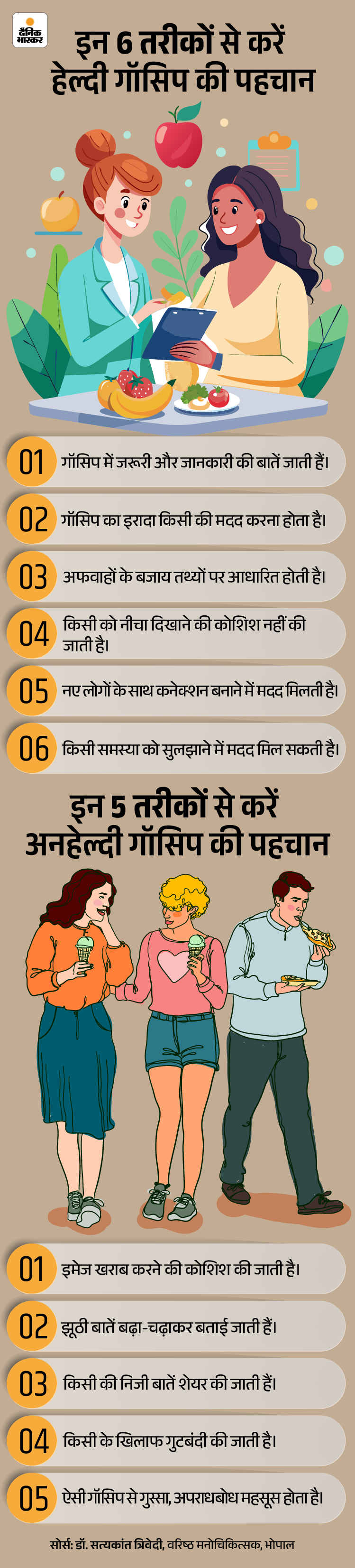 हेल्दी गॉसिप: ऐसी गॉसिप लोगों को जोड़ने, जानकारी बांटने, सामाजिक नियम सीखने या किसी को सपोर्ट करने के लिए की जाती है। इसका मकसद किसी की बुराई करना, नीचा दिखाना नहीं होता है।