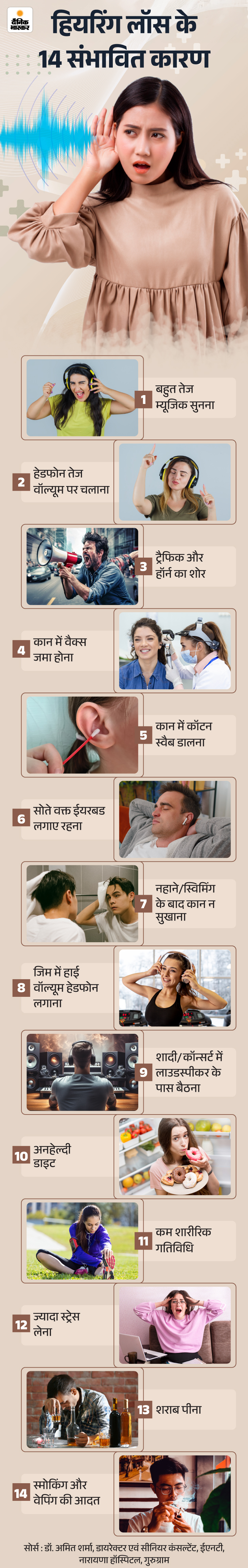 जवाब- रोजमर्रा की जिंदगी कि बहुत सी आदतें हियरिंग को नुकसान पहुंचाती हैं। नीचे ग्राफिक्स में देखिए-