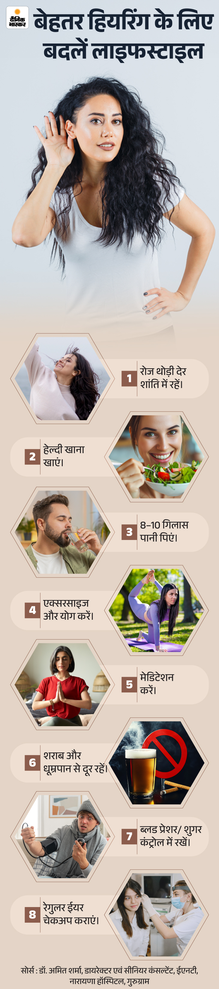 हमारी रोज की छोटी छोटी आदतें भी सुनने पर असर डालती हैं। शांत समय बिताना, हेल्दी खाना, पानी, योग-एक्सरसाइज और मेडिटेशन, ये सब आपके शरीर को बैलेंस रखते हैं। ये आसान स्टेप्स छोटे लग सकते हैं, लेकिन इनका असर बड़ा और लाइफ-चेंजिंग होता है।