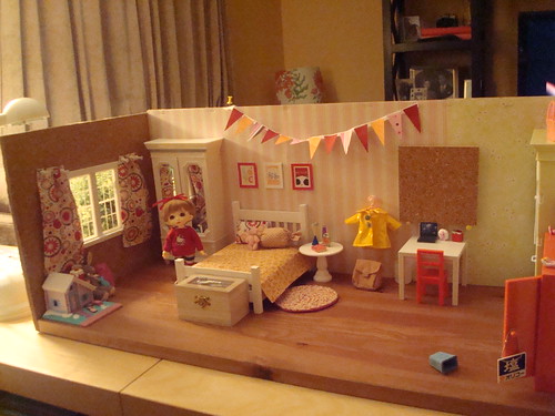 Behind the scenes: I made this room out of a shelf I had from an old bookcase (which is now the floor) and the walls are made up of corkboard that I cut up, glued and nailed to the edge of the shelf. The "wallpaper" is scrapbook paper stapled on and thebulletin board and curtains are held up with pushpins! I finally feel like she found her spot in our home:) TFL!