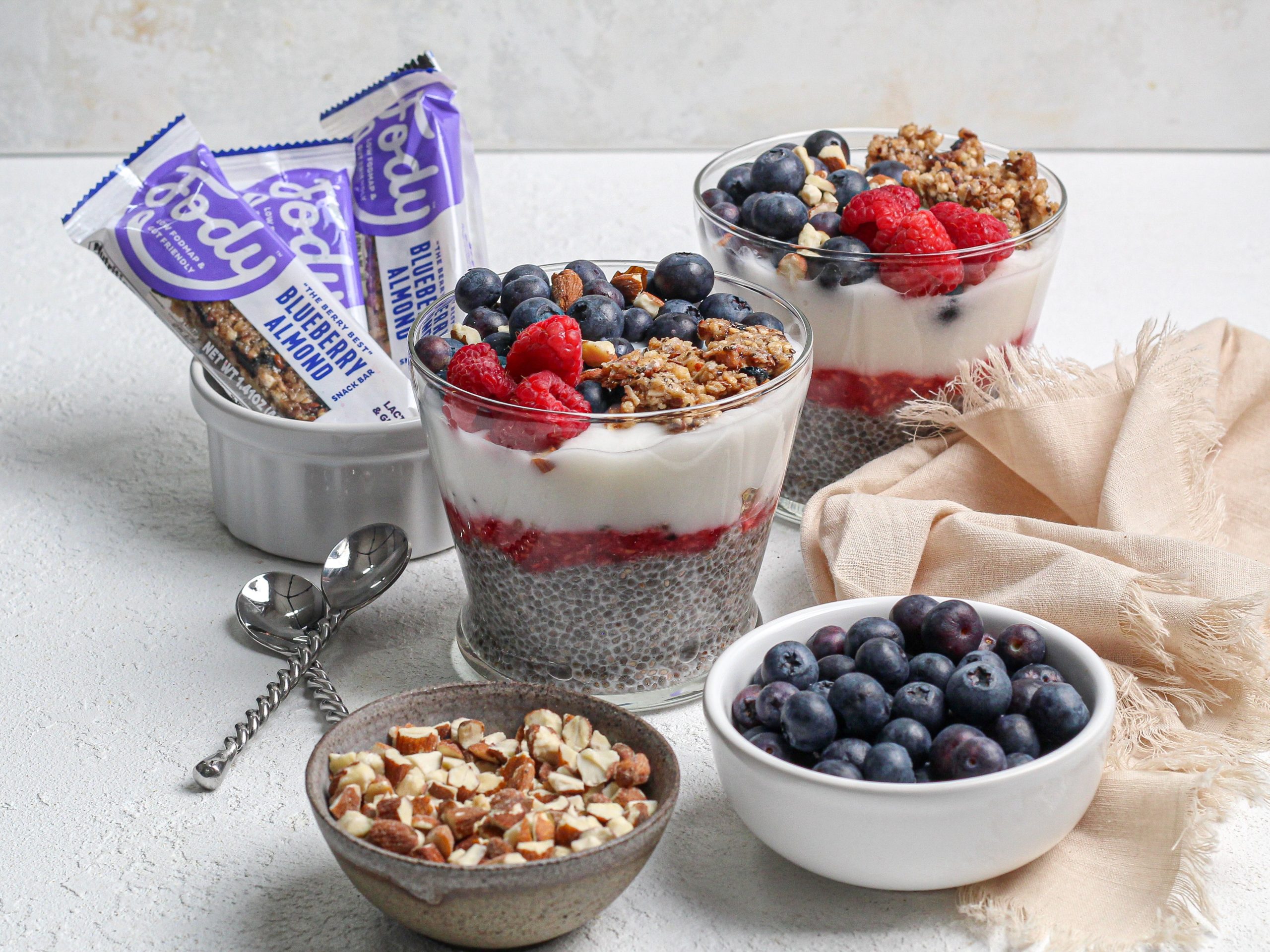 Break snack bars into small, bite-sized fairly uniform chunks. Divide chia pudding between 4 serving glasses or dishes. Top evenly with mashed raspberries, then layer with snack bar chunks. Top with yogurt. Top with blueberries and almonds. (You can build the layers in your preferred order).