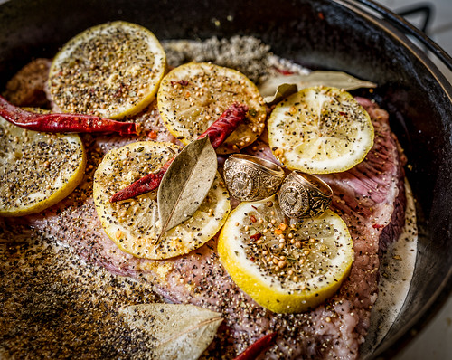 Now that the brisket was nice and seared on all sides, Aggie Ring had me put it into his “new” cast iron dutch oven with the fat cap on top. Then, he meticulously had me thinly slice a lemon and remove the seeds. He had me cover the fat cap with the lemon slices and a variety of spices and peppers and a bay leaf or two. Hell, Aggie Ring even had me throw in a handful of dried red peppers. I asked him if he was sure he wanted to use the peppers and he just replied, “I’m Aggie Ring damnit. I can do whatever I want and this is how I roll! Grab your equipment ‘Camera Boy’ and take a photo of me and ’84 on top of this beautiful piece of culinary art.”