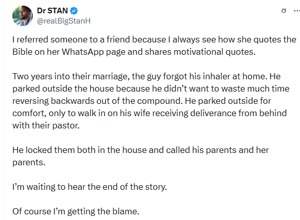 A Nigerian doctor, Stan, who shared the story said the man who happens to be a friend, had caught his wife having s3x with the pastor in their matrimonial home.