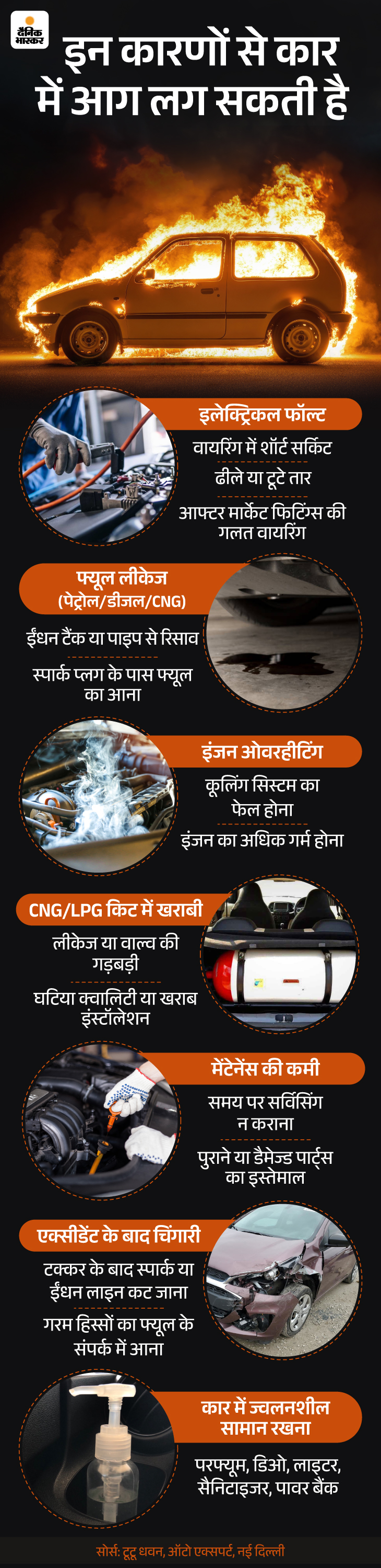 सवाल- चलती कार में आग लगने का कारण क्या है? जवाब- ऑटो एक्सपर्ट टूटू धवन बताते हैं कि कार में आग लगने की सबसे बड़ी वजह इलेक्ट्रिकल वायरिंग में गड़बड़ी और फ्यूल लीकेज होती है। अगर कार की सर्विसिंग समय पर न हो या कोई लोकल गैरेज से आफ्टरमार्केट फिटिंग कराई गई हो तो आग लगने का खतरा कई गुना बढ़ जाता है। इसके अलावा कई बार लोग सस्ते इलेक्ट्रॉनिक एक्सेसरीज या अनट्रेंड टेक्नीशियन से CNG किट या साउंड सिस्टम जैसी फिटिंग्स करवा लेते हैं। इससे वायरिंग में शॉर्ट सर्किट हो सकता है। वहीं फ्यूल टैंक या पाइप में हल्का सा भी रिसाव अगर इंजन की गर्मी के संपर्क में आ जाए तो आग लग सकती है।