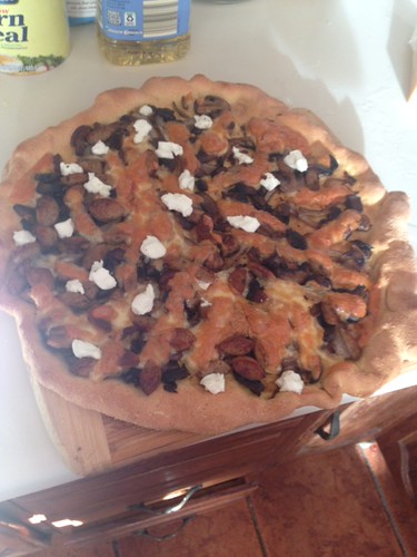 I trued a "gourmet" style pizza, with grilled onions and mushrooms, mozzarella and goat cheese. Next time I will add red sauce-otherwise it seems to dry.
