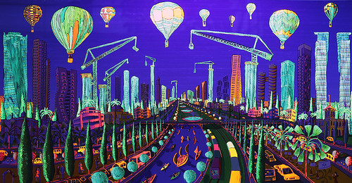 Answer: To give depth to the painting, I build the painting with layers of vegetation, after those low famous buildings, followed by a tall avenue of trees, and behind them towers and skyscrapers, in the sky I sometimes put innocent signs of balloons, kites.