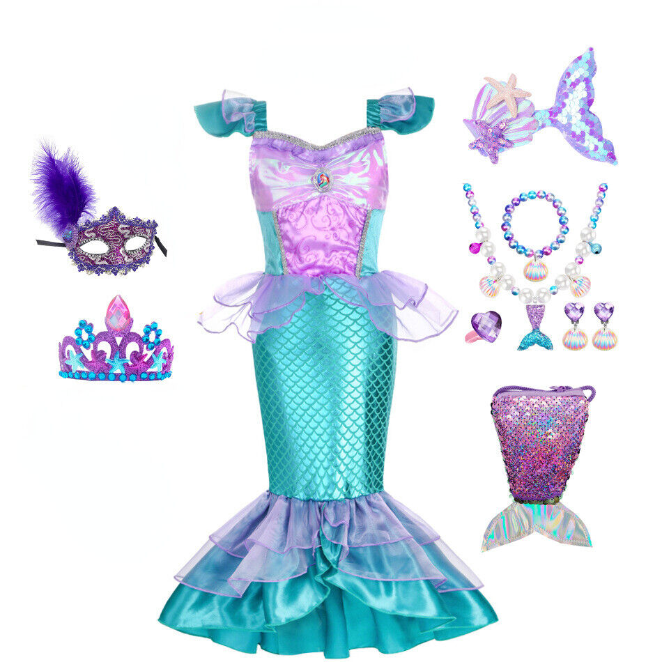 New Kids Girls Princess Mermaid Dress Queen Cosplay Costume Fancy Dress& 8Pc set