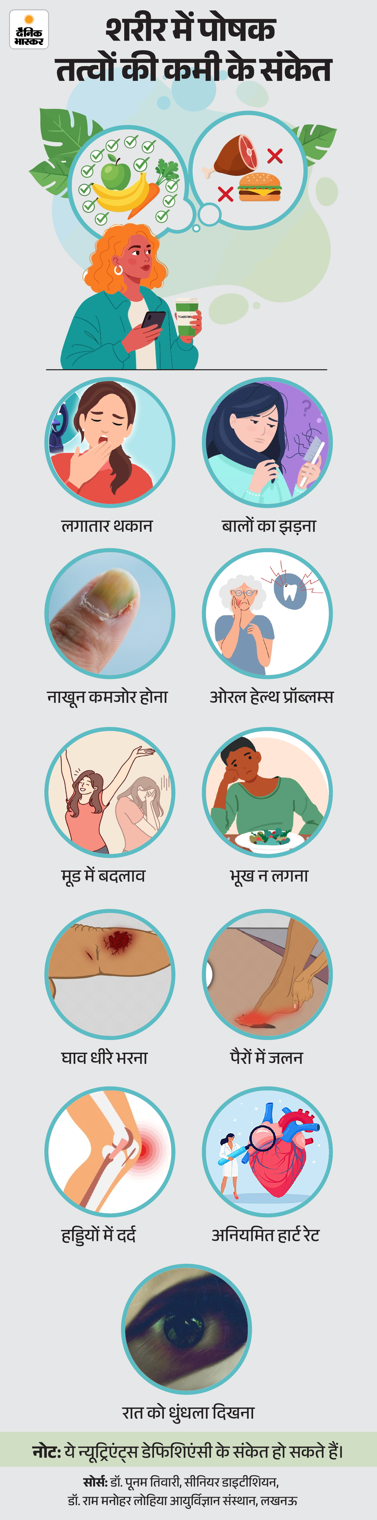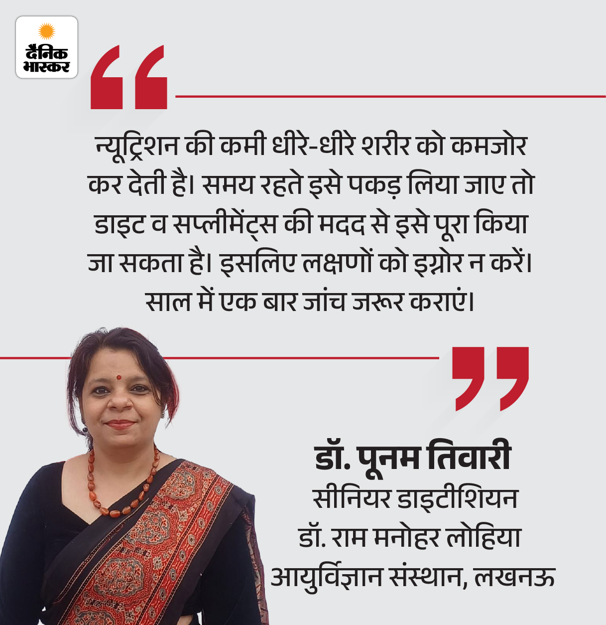 जवाब- सीनियर डाइटीशियन डॉ. पूनम तिवारी बताती हैं कि शरीर के लक्षणों के आधार पर कई बार न्यूट्रिएंट डेफिशिएंसी का अंदाजा लगाया जा सकता है। जैसेकि-