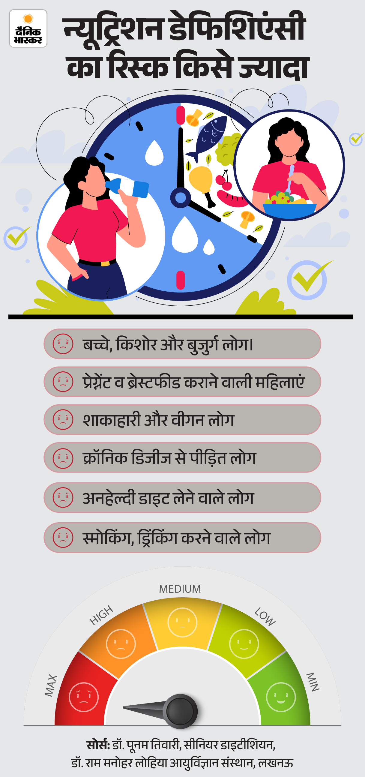 जवाब- कुछ लोगों को पोषक तत्वों की कमी का रिस्क दूसरों की तुलना में ज्यादा होता है। इसे नीचे दिए ग्राफिक से समझिए-